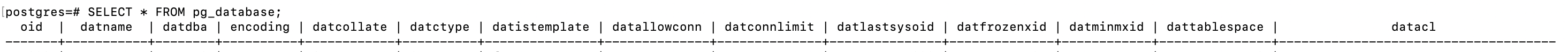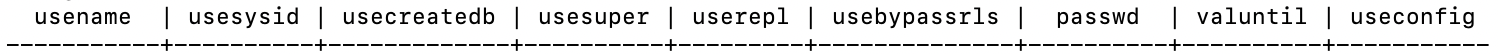 이미 나는 다른 username들을 생성해놔서 PG_USER를 호출했을 때, 다른 리스트들도 보여서 캡쳐는 별도로 하지는 않았지만, 사용자의 설정을 확인해 볼 수 있다.