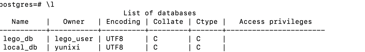 전체 database 조회는 \l 명령어를 통해 확인 가능하다.