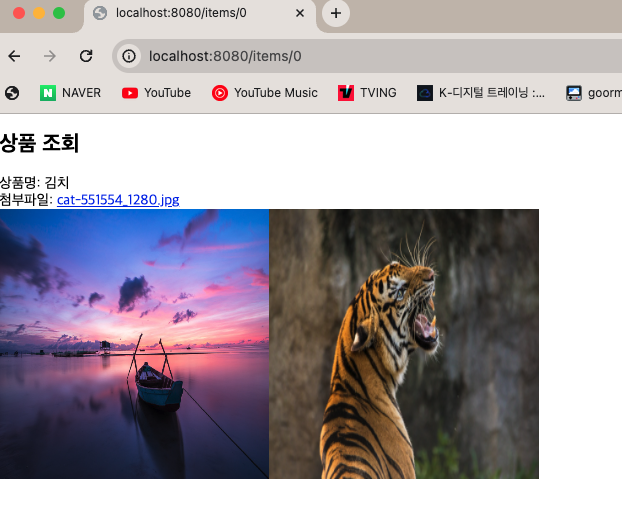 @GetMapping("/items/new") : 등록 폼을 보여준다.@PostMapping("/items/new") : 폼의 데이터를 저장하고 보여주는 화면으로 리다이렉트 한다. @GetMapping("/items/{id}") : 상품을 보여준다.@GetMapping("/images/{filename}") : <img> 태그로 이미지를 조회할 때 사용한다. UrlResource 로 이미지 파일을 읽어서 @ResponseBody 로 이미지 바이너리를 반환한다. @GetMapping("/attach/{itemId}") : 파일을 다운로드 할 때 실행한다. 예제를 더 단순화 할 수 있지만,파일 다운로드 시 권한 체크같은 복잡한 상황까지 가정한다 생각하고 이미지 id 를 요청하도록 했다. 파일 다운로 드시에는 고객이 업로드한 파일 이름으로 다운로드 하는게 좋다. 이때는 Content-Disposition 해더에attachment; filename="업로드 파일명" 값을 주면 된다.