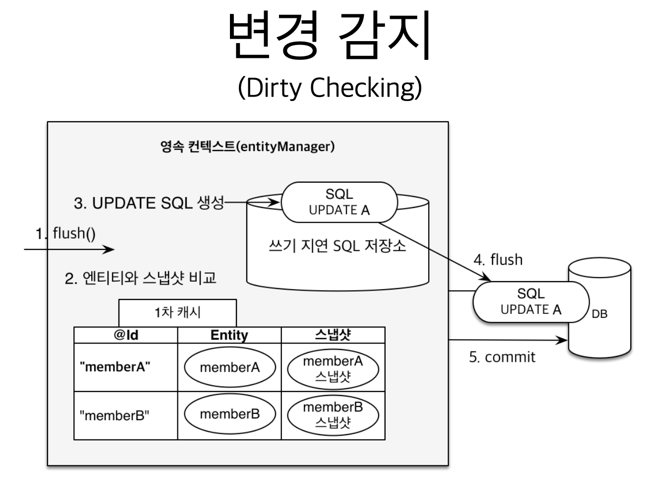 - 트랜잭션 커밋 -> flush 자동호출