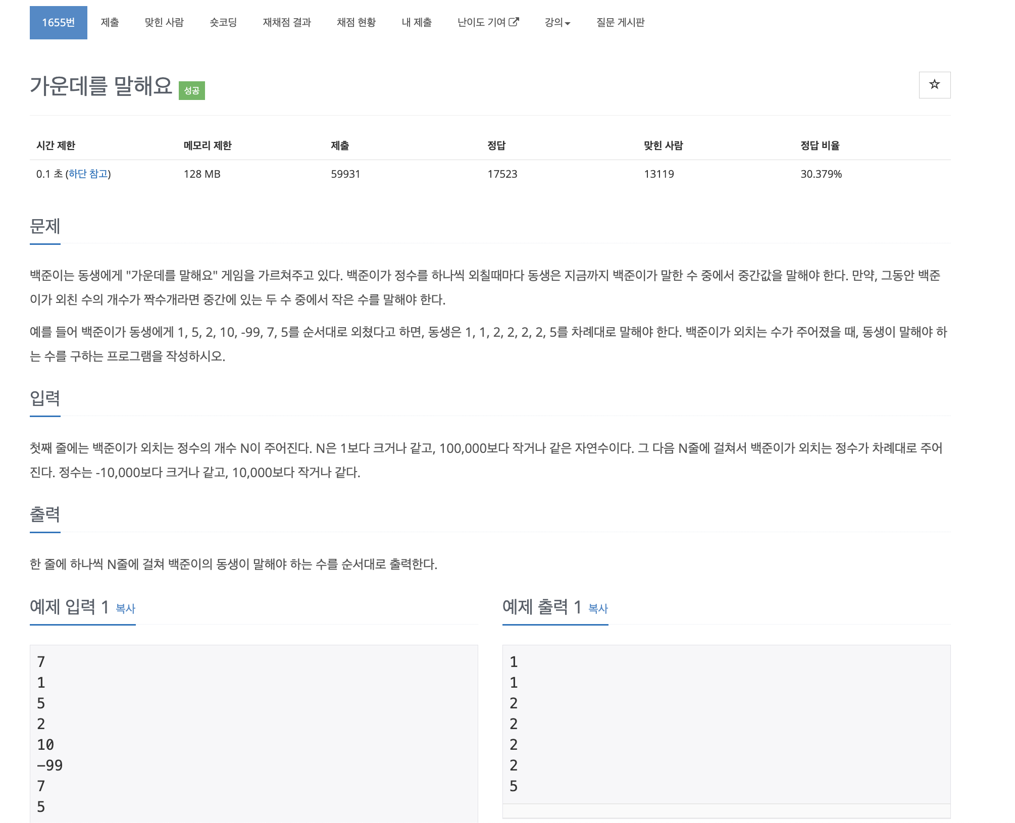 -> PriorityQueue를 이렇게 창의적으로 이어붙어서 사용할 수 있구나? 처음에는 PriorityQueue가 get()메소드를 가지고있다 생각하고 하나의 PriorityQueue를 사용하여 중간 index값을 반환하는 식으로 풀이를 진행하였다... 하지만 get() 메소드가 없다는 것을 인지했고, 생각하다가 PriorityQueue를 이어붙인 느낌으로 구현하였다. 정말 참신하고 재미있는 문제이다.