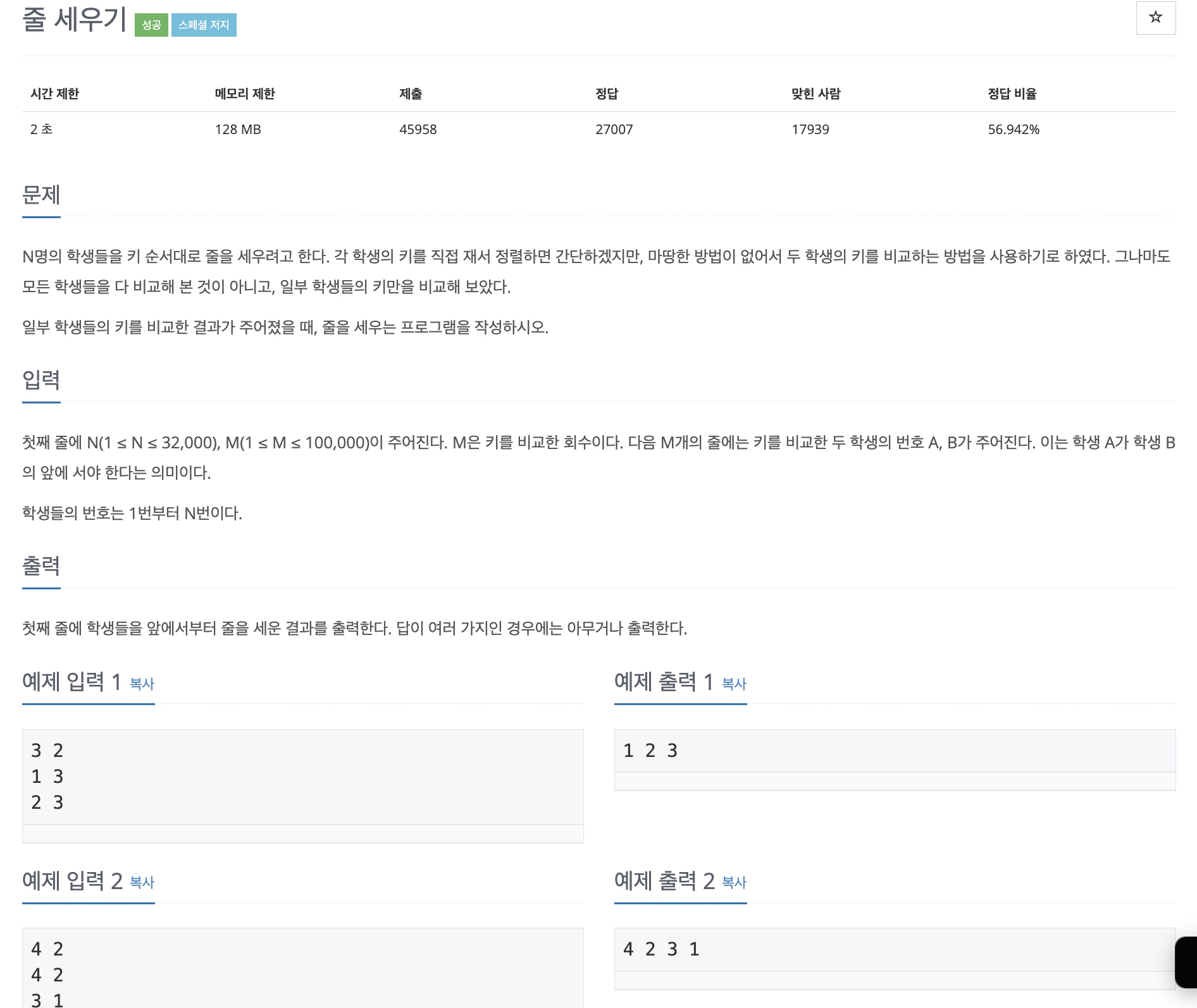 - 오랜만에 풀어본 위상정렬 문제였다. graph 탐색을 이용하여 풀 수 있는 문제는 무궁무진 한 것 같다. 적재적소에 맞는 알고리즘을 잘 사용할 수 있도록 문제를 많이 풀면서 문해력도 늘려보자.