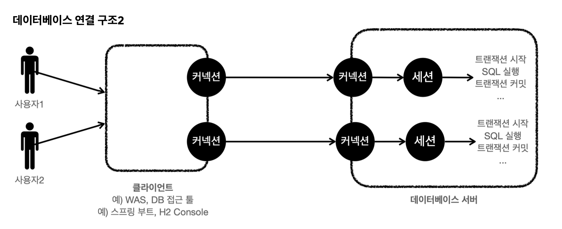 사용자는 웹 애플리케이션 서버(WAS)나 DB 접근 툴 같은 클라이언트를 사용해서 데이터베이스 서버에 접근할 수 있다. 클라이언트는 데이터베이스 서버에 연결을 요청하고 커넥션을 맺게 된다.