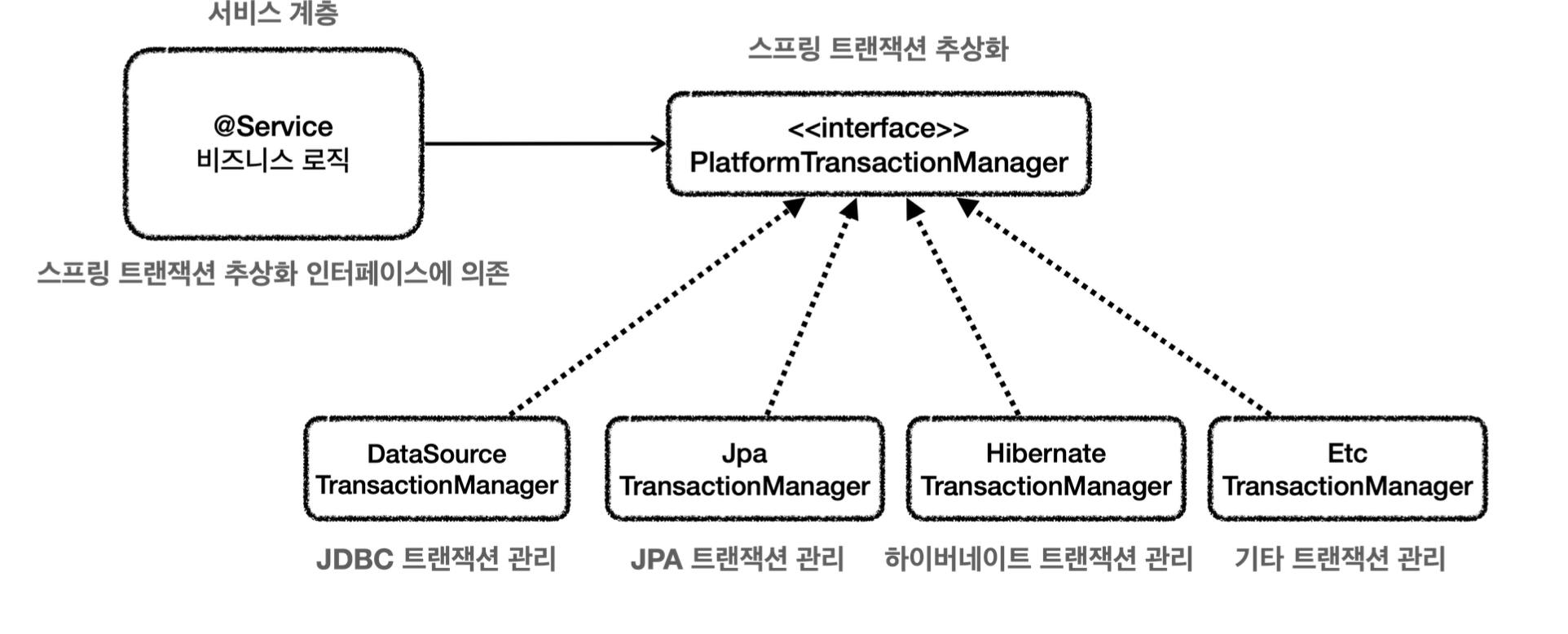 서비스는 특정 트랜잭션 기술에 직접 의존 하는 것이 아니라 Platform TransactionManager라는 추상화된 인터페이스에 의존한다. 개발자는 스프링이 제공하는 트랜잭션 추상화 기술을 그대로 사용하면 된다. 또한 데이터 접근 기술에 따른 트랜잭션 구현체도 대부분 스프링이 만들어 두어서 가져다가 사용하기만 하면된다.